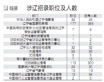 經(jīng)過統(tǒng)計(jì),在中央國家行政機(jī)關(guān)直屬機(jī)構(gòu)和派出機(jī)構(gòu)中,涉及遼寧的單位有11個(gè),國務(wù)院系統(tǒng)參照公務(wù)員法管理事業(yè)單位涉及遼寧的單位有4個(gè)。共涉及468個(gè)職位,計(jì)劃招錄973人。