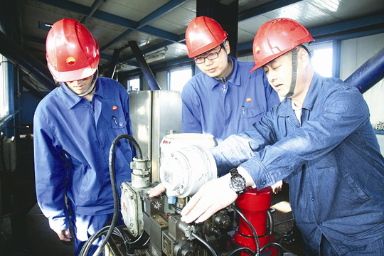 戴上安全帽,我們?cè)谥苊魅A的的帶領(lǐng)下,穿行于霧氣繚繞,機(jī)器轟鳴的車間,又坐上復(fù)合型防爆電梯,在位于地面50米高空的頂蓋崗位,我們見到了王軍。兩手油污,滿臉汗?jié)n的他正和幾個(gè)徒弟緊張地工作。利用工作間隙,王軍師徒和我們聊了起來。“我這師傅,技術(shù)老厲害了!”說這話的是一個(gè)叫裘劍的小伙子,2007年入廠的大學(xué)生。“我剛來廠子那會(huì)兒,眼兒黑呀,雖說書本上的東西知道不少,但實(shí)踐經(jīng)驗(yàn)?zāi)钦媸且稽c(diǎn)沒有呀,啥也不懂啥也不會(huì),多虧攤上個(gè)好師傅,教我們技術(shù),一點(diǎn)都不留后手兒。”與裘劍同年入廠的大學(xué)生肖文輝,提起王軍那是滿臉的敬佩。