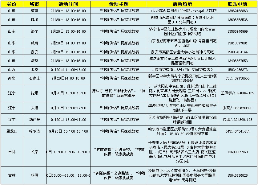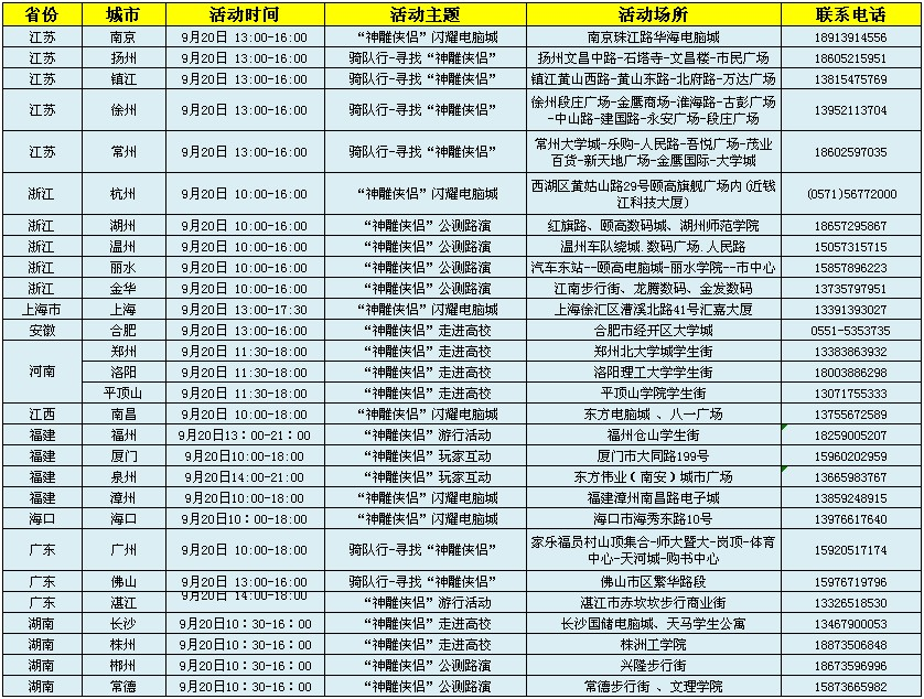 《神雕俠侶》即將到來的9月20日震撼公測, 公測當(dāng)天不僅將開啟眾多線上活動,以及為玩家備好豐厚好禮,線下更整備了大型公測日活動等待你的到來。本次《神雕俠侶》大型公測日活動將在包括北京、上海、廣州、福建、重慶、四川等24省,共58個城市同時啟動。活動內(nèi)容除了玩家挑戰(zhàn)賽之外,更有高校巡演、現(xiàn)場玩家互動問答、尋找“神雕俠侶”等多種形式,新手卡、雕雕玩偶,海量獎品等你來拿。