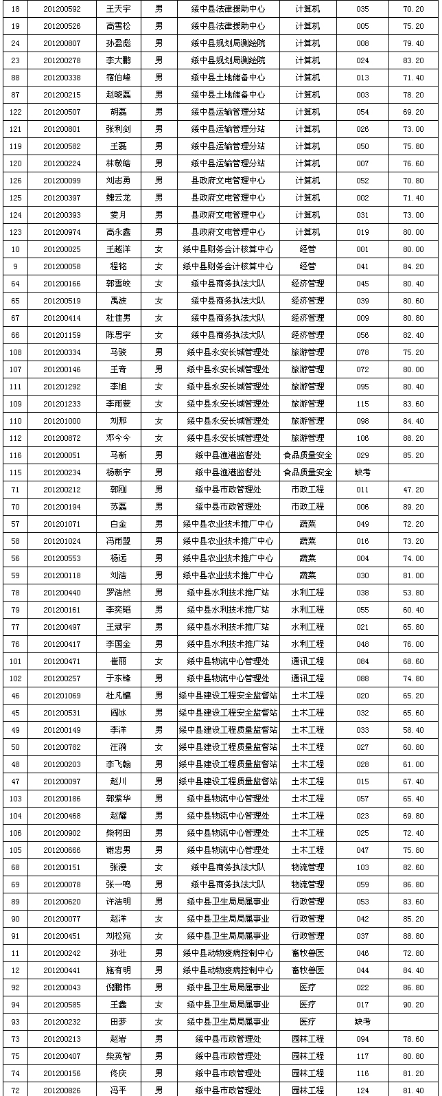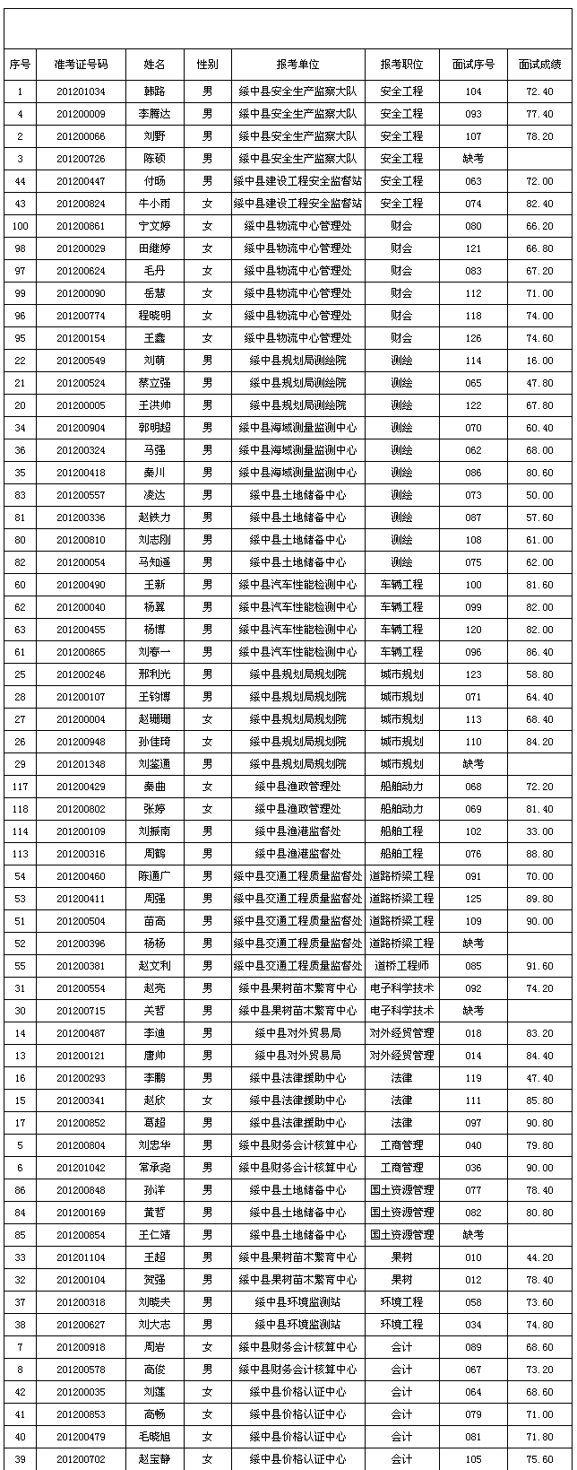 葫蘆島市綏中縣事業(yè)單位招聘面試成績