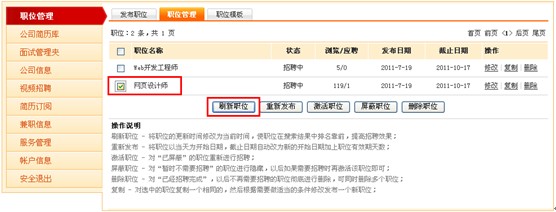注:選中您要招聘的職位,點擊“刷新職位”后,您的招聘職位就會在首頁的前面顯示了。